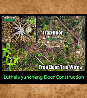 A defining behavior of Luthela yuncheng is its construction of burrows equipped with trapdoors with trip wires. the photo above illustrates the amazing intricate construction of their trap door. The burrows serve as both a refuge from predators and a strategic hunting platform. The spider excavates a vertical tunnel in the soil, lining it with silk to maintain structural integrity. The entrance is concealed with a hinged trapdoor made from a combination of silk, soil, and plant material, effectively camouflaging it within the surrounding environment. This trapdoor is connected to the burrow by a silk hinge, allowing the spider to swiftly open and close it.