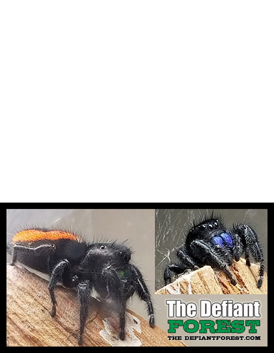 These have a bright & deep red abdomen, the deepest red in the jumping spider world. Females have an black central stripe on the back of their deep red abdomen, males have a solid deep red abdomen, beautiful. The chelicerae of both sexes are of a shining metallic royal blue color. The rest of the body is black. It is one of the species of jumping spiders that are mimics of mutillid wasps in the genus Dasymutilla (commonly known as "velvet ants".